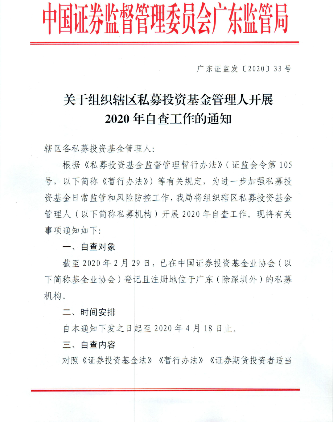 广东证监局发布2020私募自查通知,截止至4月18日